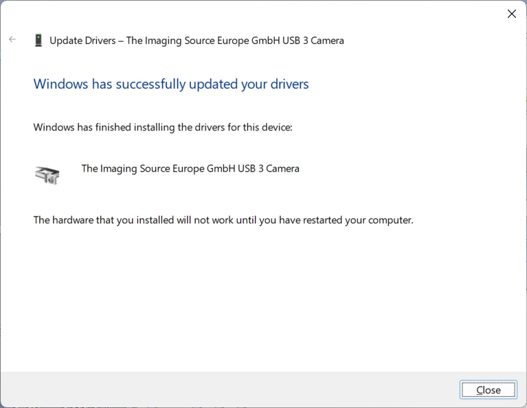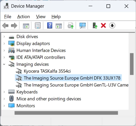 Wenn der The Imaging Source Treiber bereits auf dem Computer installiert ist, dann wird er wie im Bild angezeigt. Fehlt dieser Eintrag, wurde der Treiber einfach nicht installiert, das bitte nachholen.
