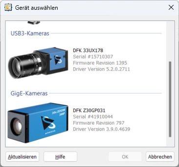 Hier fehlt bei der Kamera Seriennummer, die Firmwareversion und die Treiberversion, die IC Capture 2.5 im Kameraauswahldialog anzeigt. Eine weitere Folge ist, dass viele Kameraeigenschaften, wie Trigger, Tonemapping usw. fehlen.