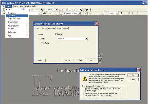 Enable the trigger mode by clicking Device > Properties... > Device > Enable (see the images below). If you encounter the dialog Activation External Trigger, click Disable all property automations... Consequently, set all camera parameters according to the requirements of your application. You can find these parameters in the Device Properties dialog (Device > Properties...):