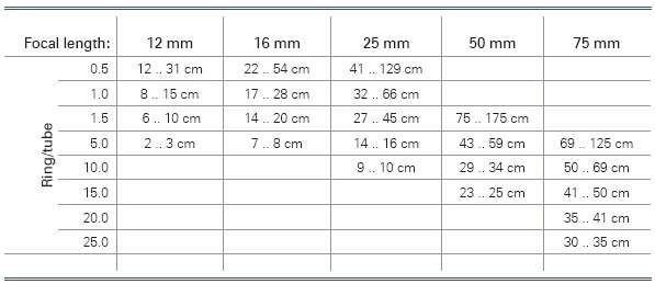 Especially in the case of small objects, the working distance may be smaller than the selected lenses minimal working distance (MOD). In this case, we decrease the minimal working distance by putting extension rings between the lens and the camera. We will see details at Step 4 (Setup). The following example depicts the selection of an extension ring: