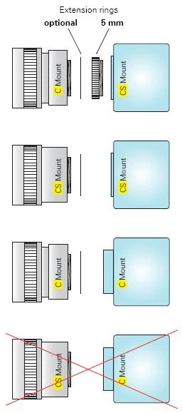 In the field of digital image processing, we have a standardized lens mount with two variants: C mount and CS mount. This leads to four combinations (see image on the right), one of which does not work: CS mount lenses can not be used with C mount cameras.