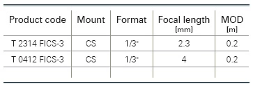 In this case the focal length is 2.3 mm and thus one of the lowest commercially available. Therefore, we use the Computar T 2314 FICS-3 (see table below).
