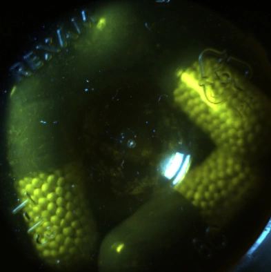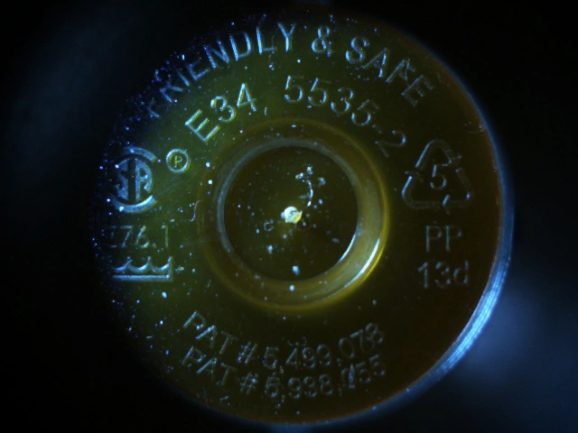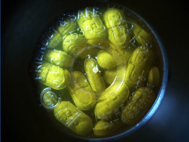 Centice's proprietary implementation of Raman Spectroscopy measures the chemical contents of the pills. Sometimes the spectroscopy alone is insufficient to determine whether the correct pills are in the vial. In some cases, families of medications such as Liptor® and Levothroid® have precisely the same spectral signature, but come in a variety of doses that must be differentiated one from another. Other families of drugs have fluorescence characteristics difficult for the spectroscopy to discriminate. These drugs almost always have differences in sizes, shapes, and/or colors. It is up to the machine vision to measure these visible differences. This is a difficult problem because the machine vision camera must look through the amber vial to evaluate the objects inside. The plastic vial bottoms have molded writing and logos, multiple angled surfaces of different thickness, and a variety of mold artifacts and anomalies that must be ignored or subtracted to perform the inspection properly. Figure 1 is an image of an empty vial as seen by the vision system. Figure 2 is an image of a vial full of one of the Levothroids® as seen by the vision system.