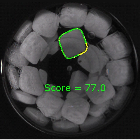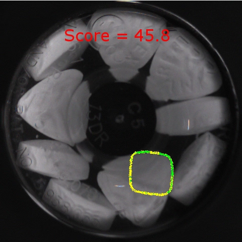 Often though, the first category of shape and size features is insufficient to to categorize a pill correctly. In those cases, an expected shape/size set is passed to the vision system that describes the boundaries and areas of the pill family identified by the spectroscopy. This is a very effective method of correctly identifying the shape in the vial, but requires the use of computationally intensive and often, non-deterministic image processing techniques. Figure 4 shows the result of a search for a pill with an expected diamond shape of an expected size. Figure 5 shows that same inspection but with the pills of the incorrect shape and size in the vial.