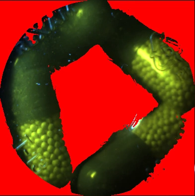 The challenge of color is twofold. First, the camera has to be calibrated in a manner that best accommodates the spectra of the vial material. Second, the pixels that hold valid color information must be separated from the pixels that do not. The pixel selection problem is different from the one described in the paragraphs on shape and size features. Those pixels that hold good shape information might not be so good for evaluating color if they fall in an area of shadow or glint. After the pixels are selected, color histograms are calculated for several color spaces. The color channel histograms are then evaluated against reference histograms. Pixels with no useful color information are marked in red in the vial image shown in Figure 6. The original image is shown in figure 7.