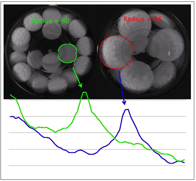 The shape and size features are divided into two categories: 1) features of the predominant shape in the bottle irrespective of a priori information, and 2) features that describe conformance to a known shape set. The first method of shape evaluation is preferable because it does not require retrieval of pill information from a data store to start the inspection. Shape feature extraction depends only on the ability to identify those pixels in the image associated with objects inside the vial rather than outside the vial or on the vial, accumulation of those pixels into segments that are contiguous spatially or spectrally, and calculation of features based on the areas or boundaries of those segments. Figure 3 shows results of searches for two pills where the predominant shapes are circles of different sizes.