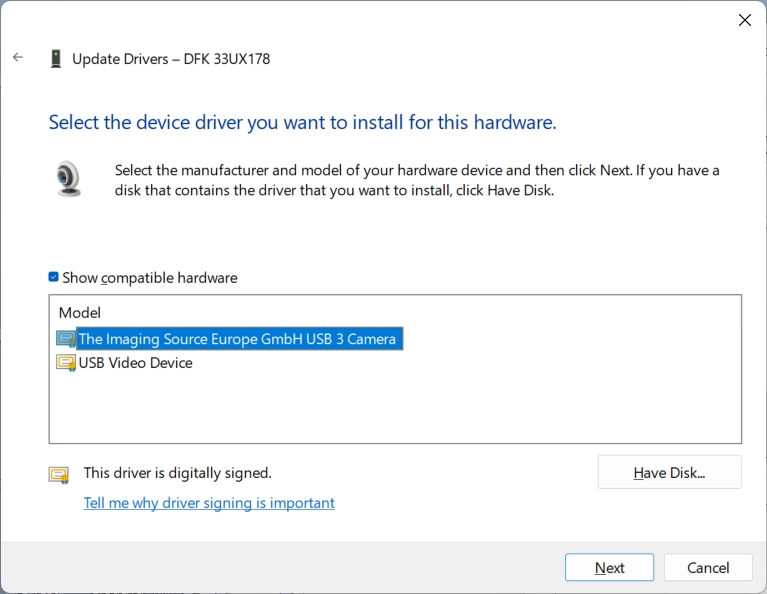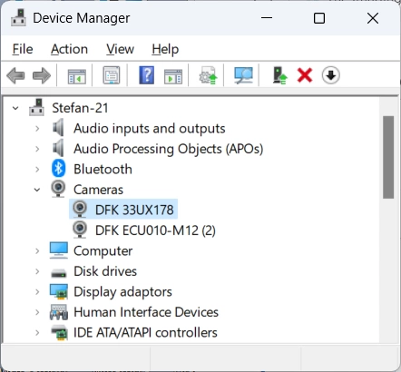 If the The Imaging Source driver is already installed on the computer, it will be displayed as shown in the picture. If this entry is missing, the driver has simply not been installed.