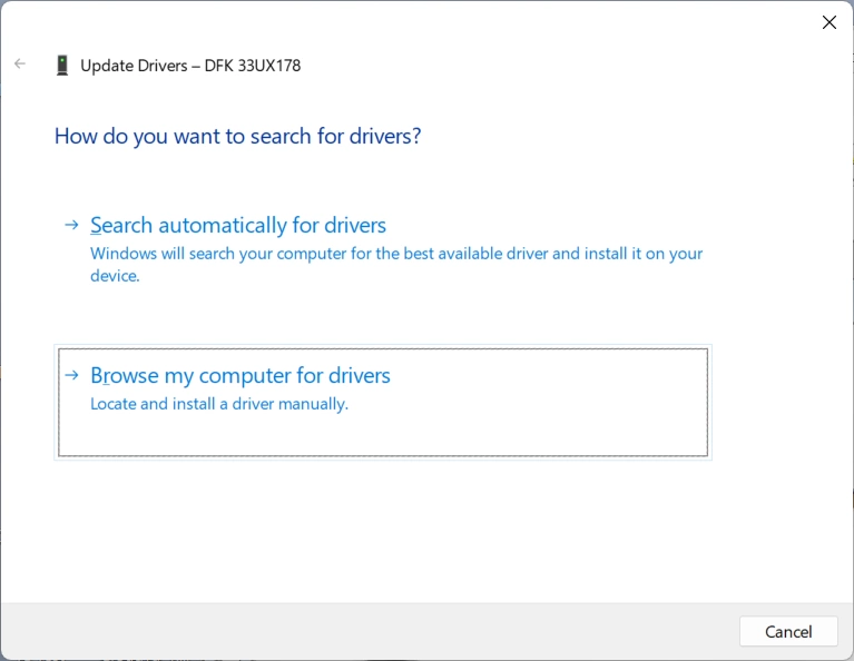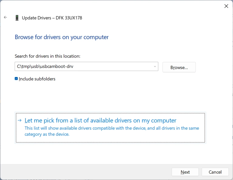 The DFK 33UX178 is displayed here under "Cameras", which indicates the wrong driver. The camera is expected to be listed under "Imaging devices" if the correct driver is installed. Now right-click on the camera and select "Update driver" from the context menu. The following dialog appears: