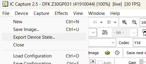 Since version 2.5.1557.4007, the "Export Device State..." option has been available in the "File" menu. This creates an XML file for the currently selected camera, which can be loaded with the "LoadDeviceStateFromFile()" functions of IC Imaging Control 3.5.