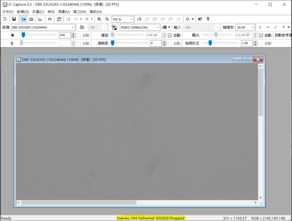 IC Capture 在其状态列中显示帧传输统计资料。 如果出现丢帧或没有影像传输的问题,此资讯非常有用。