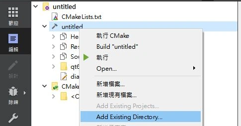 加入qt6-dialogs。范例中提供DeviceSelectionDialog以及PropertyDialog,可以将此资料夹复制并加入专案中。 在专案里右键 -> Add Existing Ditectory -> 勾选qt6-dialogs资料夹