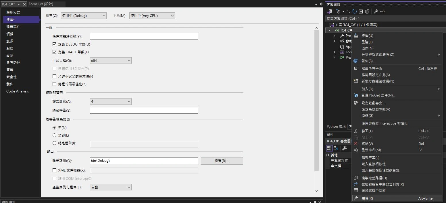 在方案总管里点选滑鼠右键 -> 属性 -> 建置 -> 取消勾选 建议使用32位元,并将 平台目标更改为x64