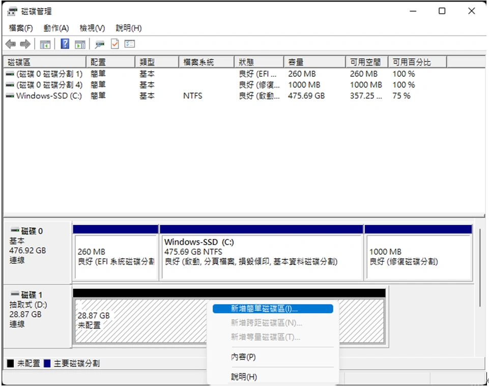 進入到 裝置管理員 → 磁碟管理 → 新增簡單磁碟區,完成後確認SD卡是否完整合併。