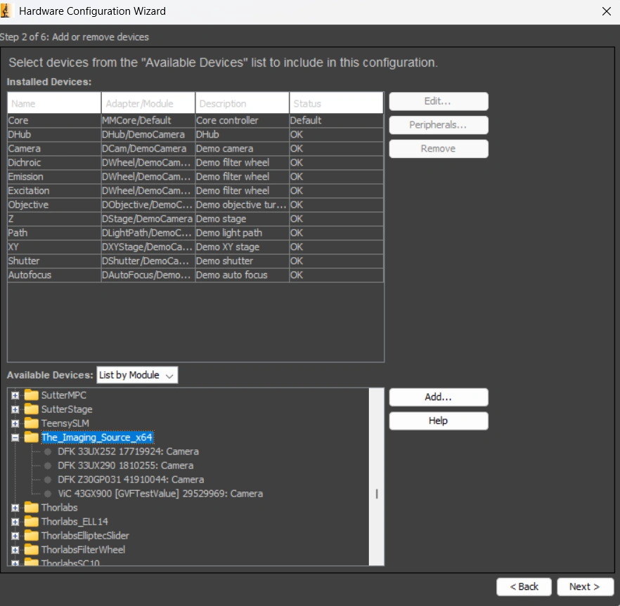 將插件的 DLL 檔案複製到 Micro-Manager 的安裝目錄後,Micro-Manager 硬體設定精靈(Hardware Wizard)將如下所示: