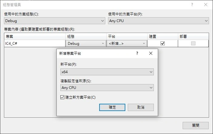 在方案總管裡點選滑鼠右鍵 -> 屬性 -> 建置 -> 取消勾選 建議使用32位元,並將 平台目標更改為x64
